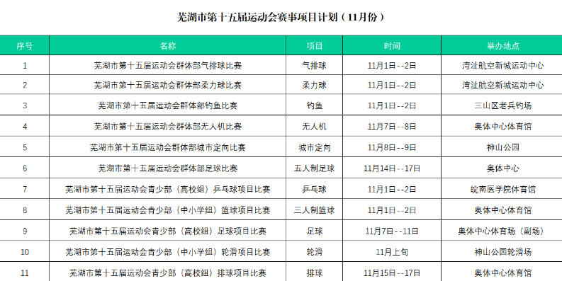 中下旬赛事同样不容错过:群体部五人制足球比赛将于11月14日至17日在奥体中心展开争夺;高校组足球项目于11月7日至11日在奥体中心体育场副场进行;高校组排球比赛则定于11月15日至17日在奥体中心体育馆举行;此外,青少年轮滑比赛也计划于11月上旬在神山公园轮滑场举行。